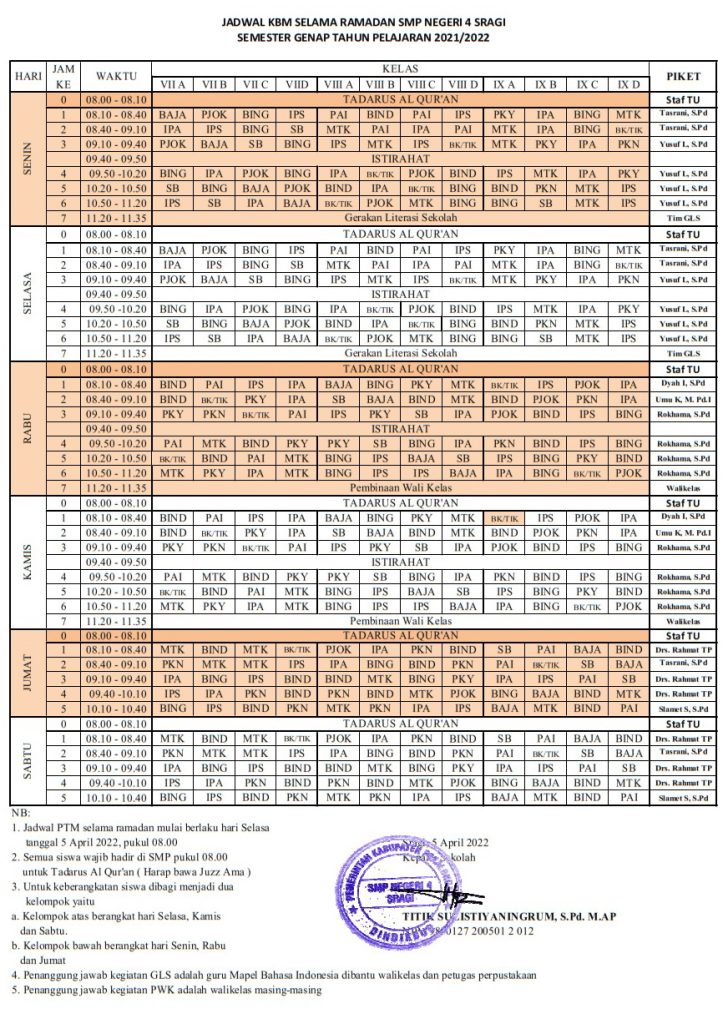 Berikut Jadwal KBM selama Bulan Ramadhan di SMP 4 Sragi